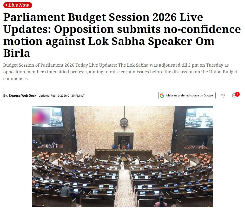 Indian Express reports that the Opposition has submitted no-confidence motion against Lok Sabha Speaker Om Birla. to Secretary General, Lok Sabha. Lok Sabha was adjourned till 2 shortly after the proceedings resumed amid constant sloganeering by the Opposition. P C Mohan, who was in the chair, tried to pacify the opposition members, but in vain, the report says. Parliamentary Affairs Minister Kiren Rijiu said while other opposition MPs were willing to speak, the Congress was not willing to initiate the debate on the Budget. Amid the ruckus, Mohan adjourned the House till 2 pm. Read the full report here.