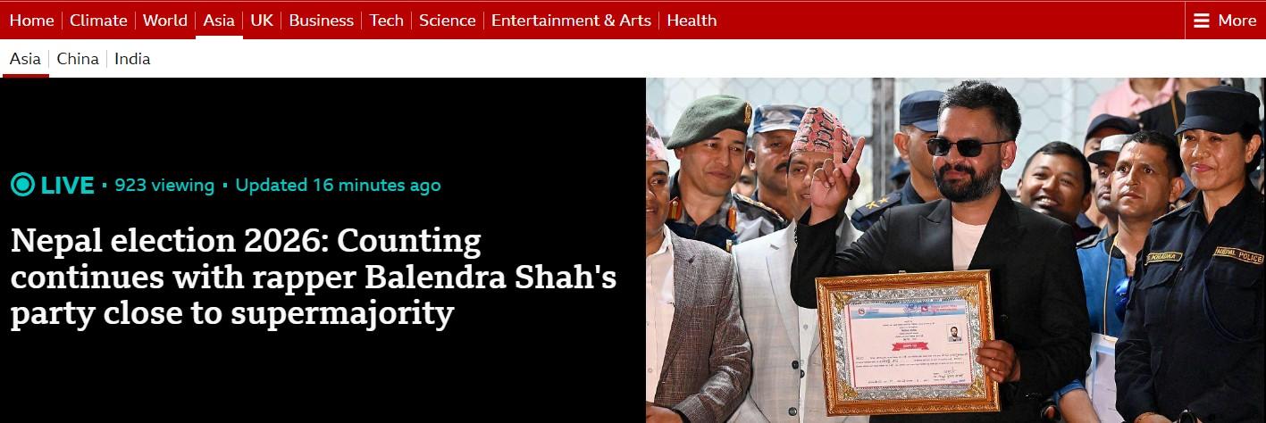 Counting is continuing in Nepal as the party of rapper and ex-Kathmandu mayor Balendra Shah is potentially just one seat away from winning a supermajority in parliament, BBC reports. The Rastriya Swatantra Party's win would mark the first time in decades that a single party has won a majority in Nepal, which has a two-system format that makes it difficult for any one party to win outright. The report adds that if the RSP secures a two-thirds majority, it would also be the first time in decades that a single party has achieved this. Read the full report here.