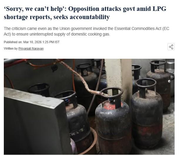 Opposition parties on Tuesday stepped up their attack on the government as several restaurant bodies in India reported a shortage of LPG cylinders amid fuel supply concerns caused by the ongoing Middle East conflict. Hindustan Times reports that the criticism came even as the government invoked the Essential Commodities Act (EC Act) to ensure uninterrupted supply of domestic cooking gas, directing refineries and petrochemical units to maximise production of liquefied petroleum gas (LPG) and divert key hydrocarbon streams to the LPG pool. Opposition leaders criticised the government over the reported shortage of LPG cylinders and the rule requiring consumers in cities to wait 25 days before booking another cylinder. Read the full report here.