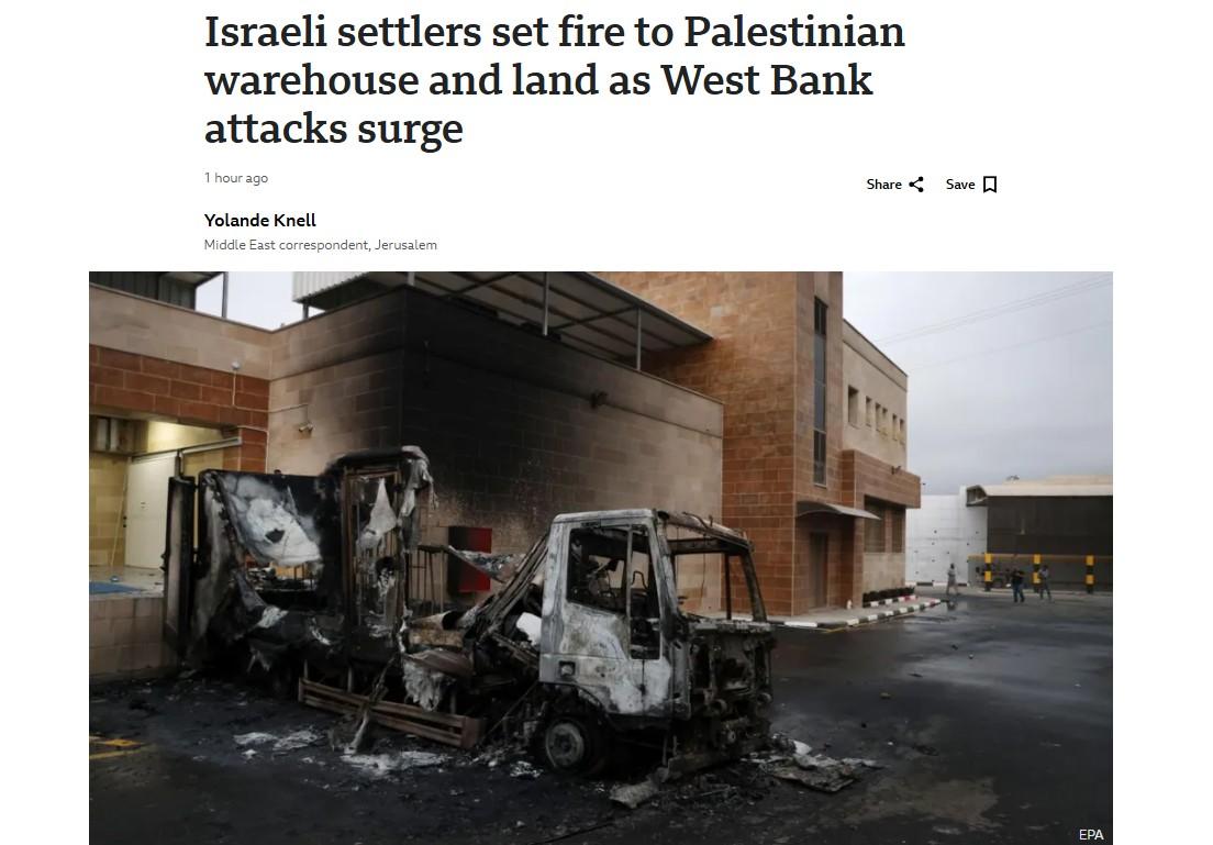 Israeli settlers set fire to Palestinian warehouse and land, BBC reports