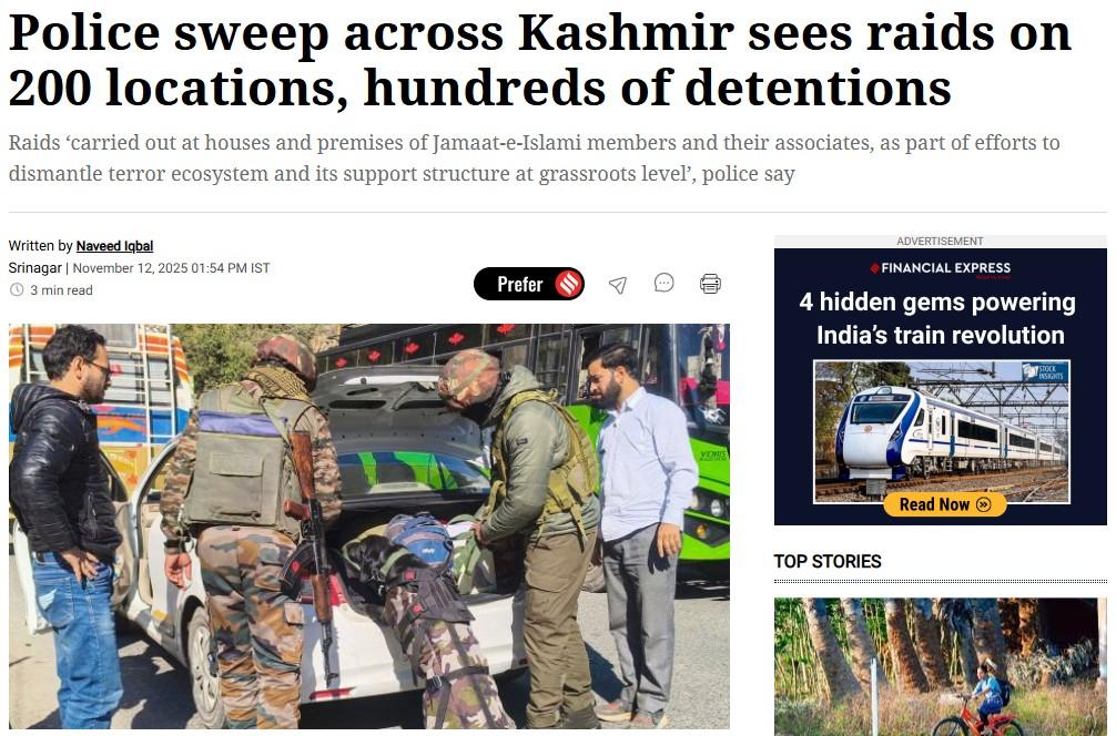 Indian Express: Police sweep across Kashmir sees raids on 200 locations, hundreds of detentions