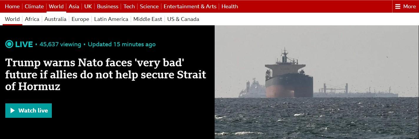 Trump warns Nato faces 'very bad' future if allies do not help secure Strait of Hormuz, BBC reports