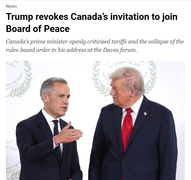 United States President Donald Trump has withdrawn an invitation for Canada to join his Board of Peace initiative aimed at resolving global conflicts, Al Jazeera reports, a step in what appeared to be a retaliatory move following Prime Minister Mark Carney’s speech at the World Economic Forum. In his speech to world leaders in Davos, Switzerland, Carney openly decried powerful nations using economic integration as weapons and tariffs as leverage, and urged nations to accept the end of a rules-based global order, receiving a rare standing ovation. Trump recently threatened a trade war against European countries which oppose his bid to acquire Greenland, an autonomous territory of the Kingdom of Denmark, the report adds. Read the full report here.