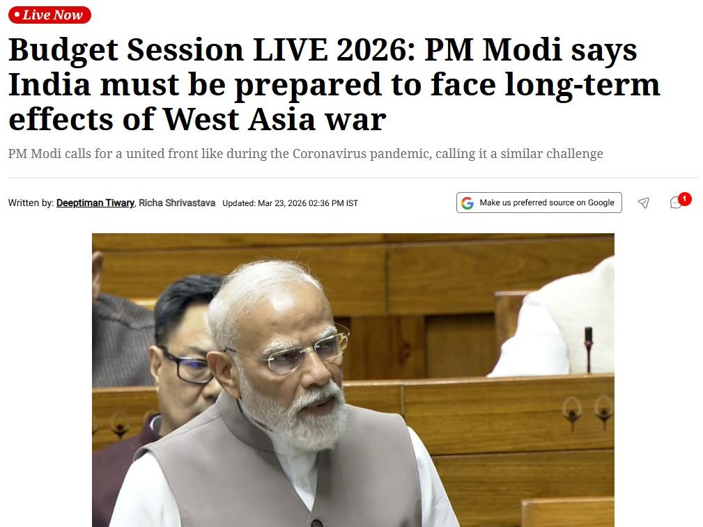 Prime Minister Narendra Modi began his address in the Lok Sabha by speaking about the West Asia conflict, Indian Express reports. He said, “The war in West Asia has put India in a tense situation.” He added that passage through the Strait of Hormuz has been challenging, and that India is in continuous touch with its citizens and is assisting them. The report adds that he further said, "India is focusing on security on all areas including coastal and cyber security. We have faced a similar situation during Covid era. Likewise, we must be prepared to face the long-term impact of the West Asia war.” Read the full report here.