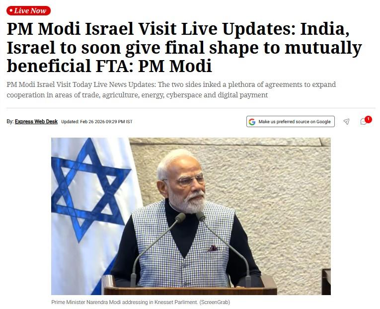 Indian Express live updates on PM Modi's Israel visit